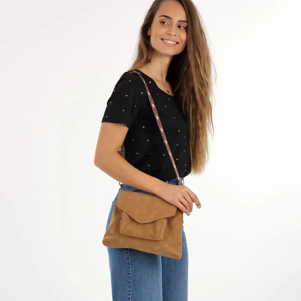 Handbag with printed and adjustable strap, the FLAP has a flap closure and numerous inside pockets.