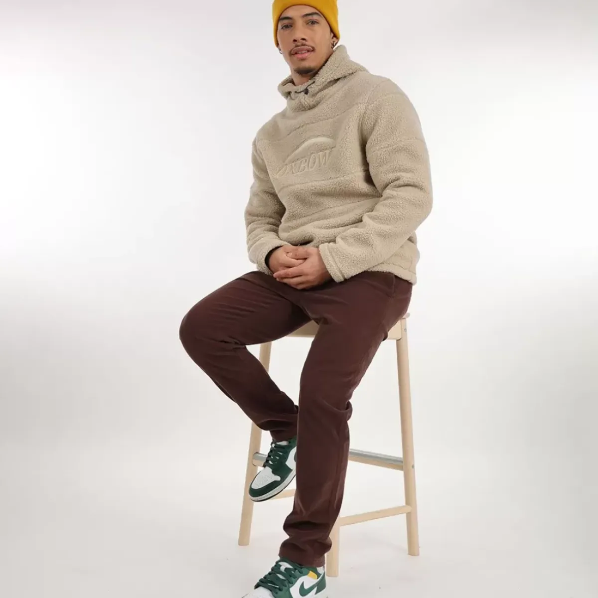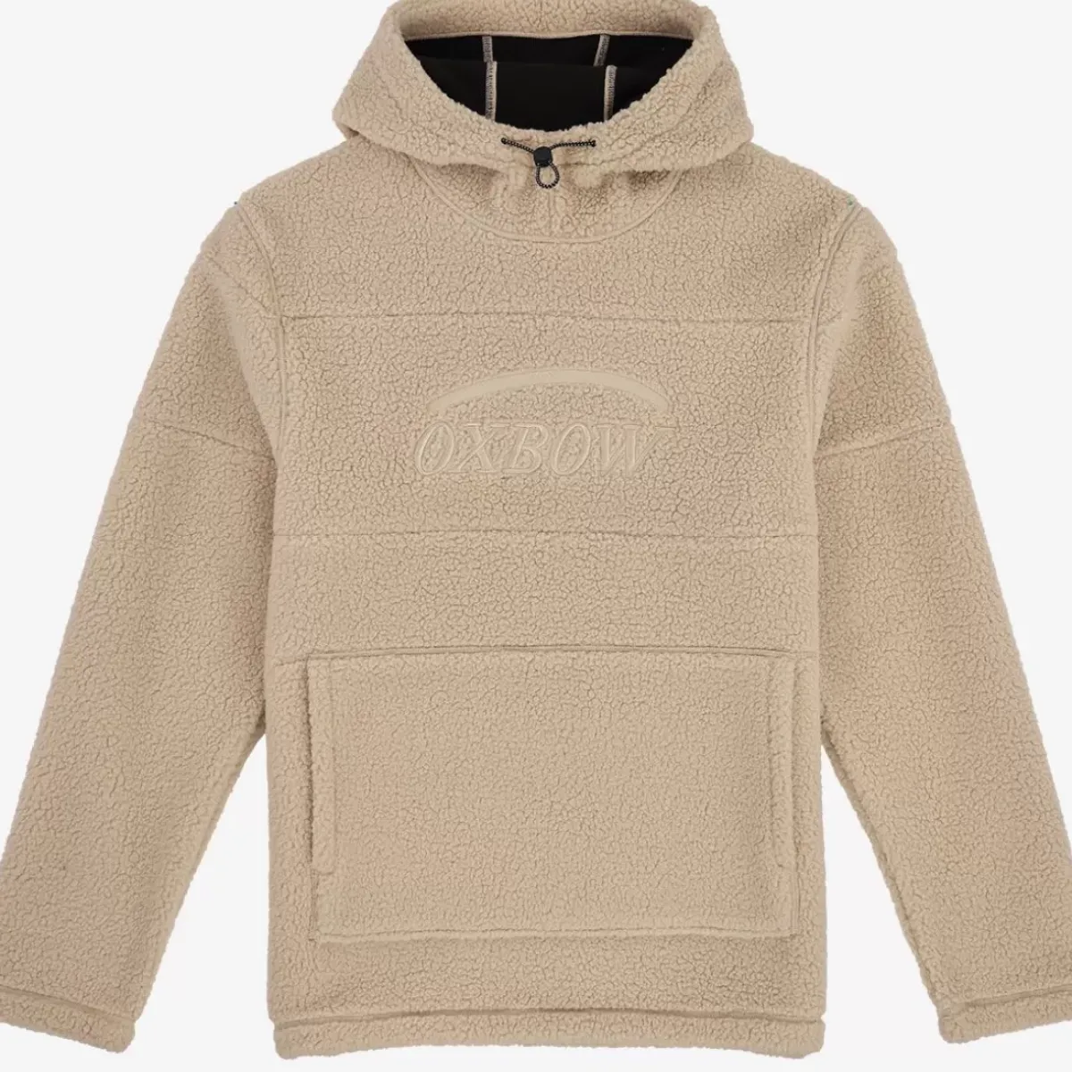 This pull-on sherpa fleece has a front kangaroo pocket and an adjustable hood.