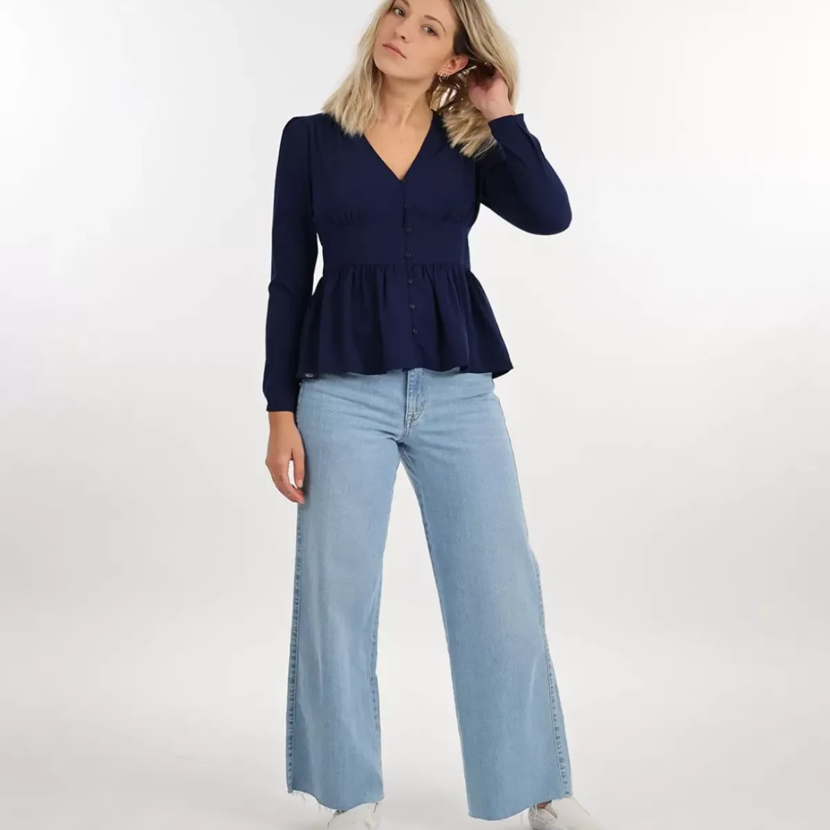 Made from a recycled material, the CARACAS blouse has a buttoned opening on a V-neck, and a fitted waist for a look