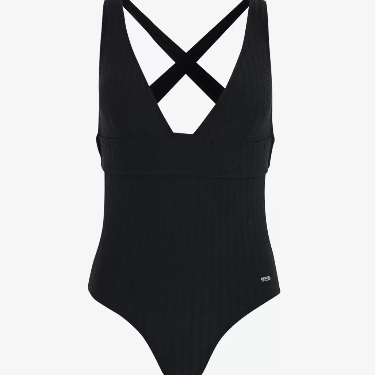 This one-piece swimsuit has large lined cups gathered under the bust. With a deep neckline in front and in the back, you will not go unnoticed.