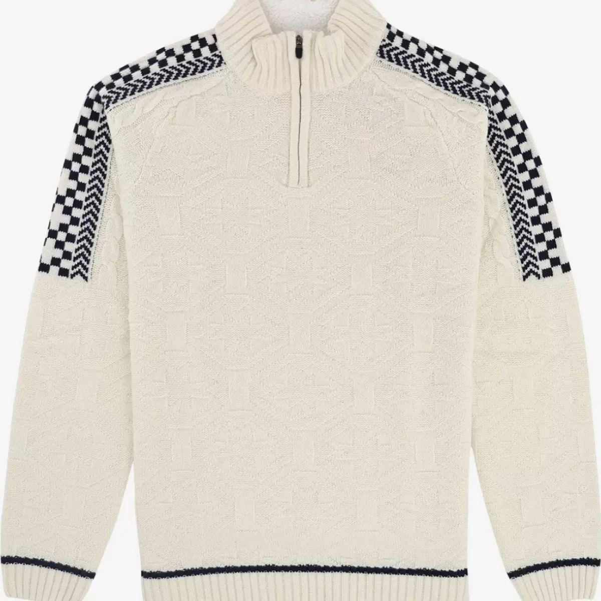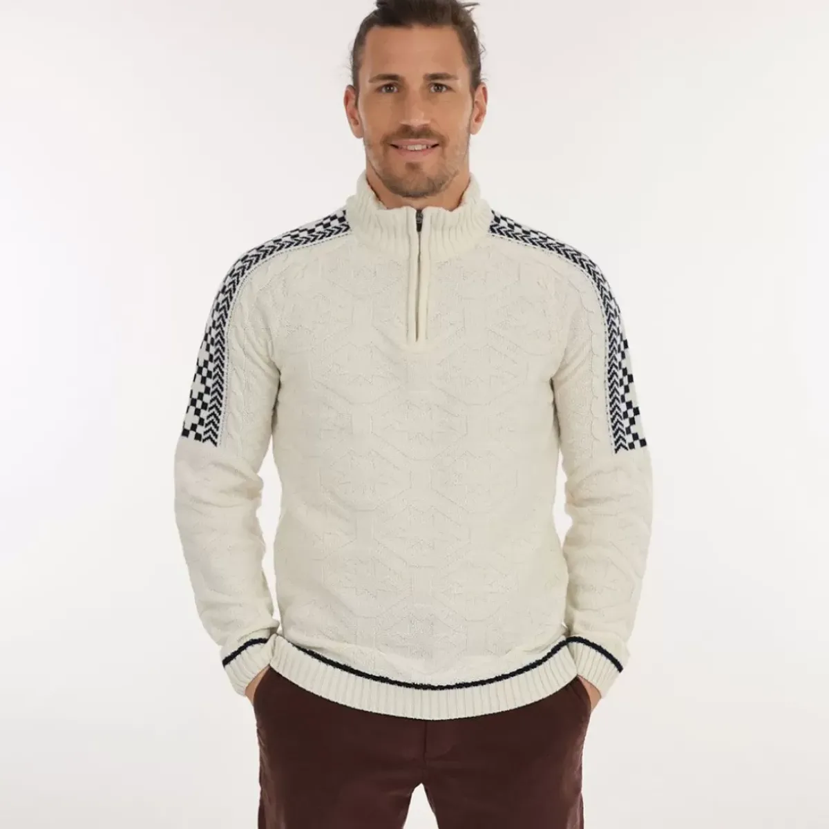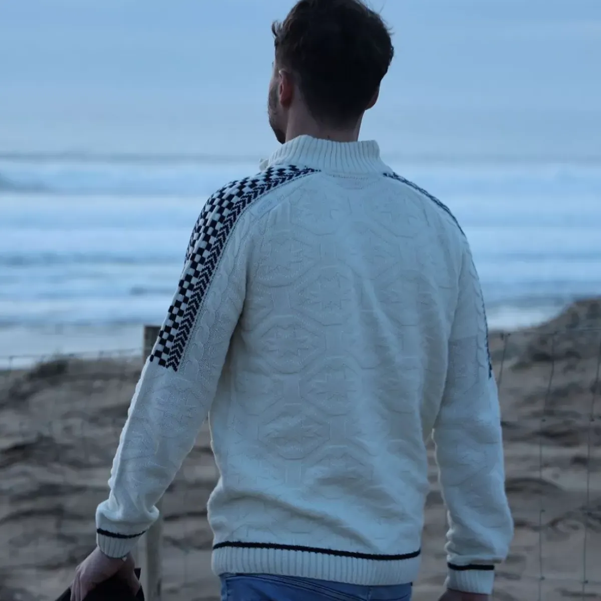A variation of the PALDOR sweater, the PAKAN is a very warm sweater with a zipped sherpa-lined collar, with tone-on-tone jacquard patterns on the front and shoulders.