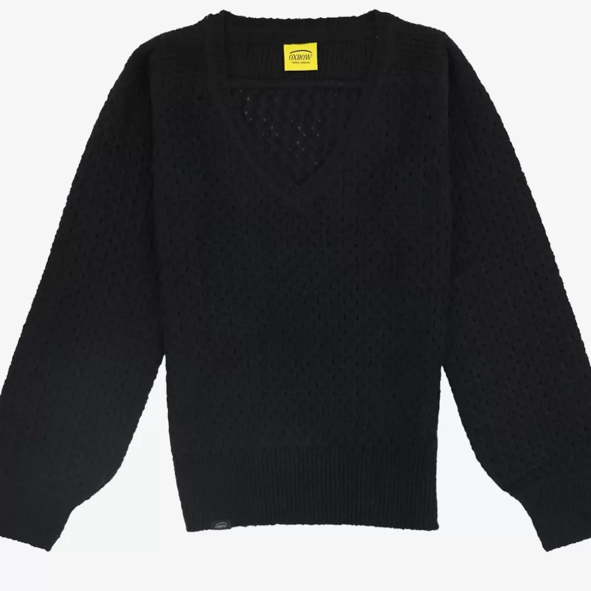 The PULMIN is a sweater designed with a fancy knit and has an open stand-up collar, not to mention the woven Oxbow patch on the shoulder.