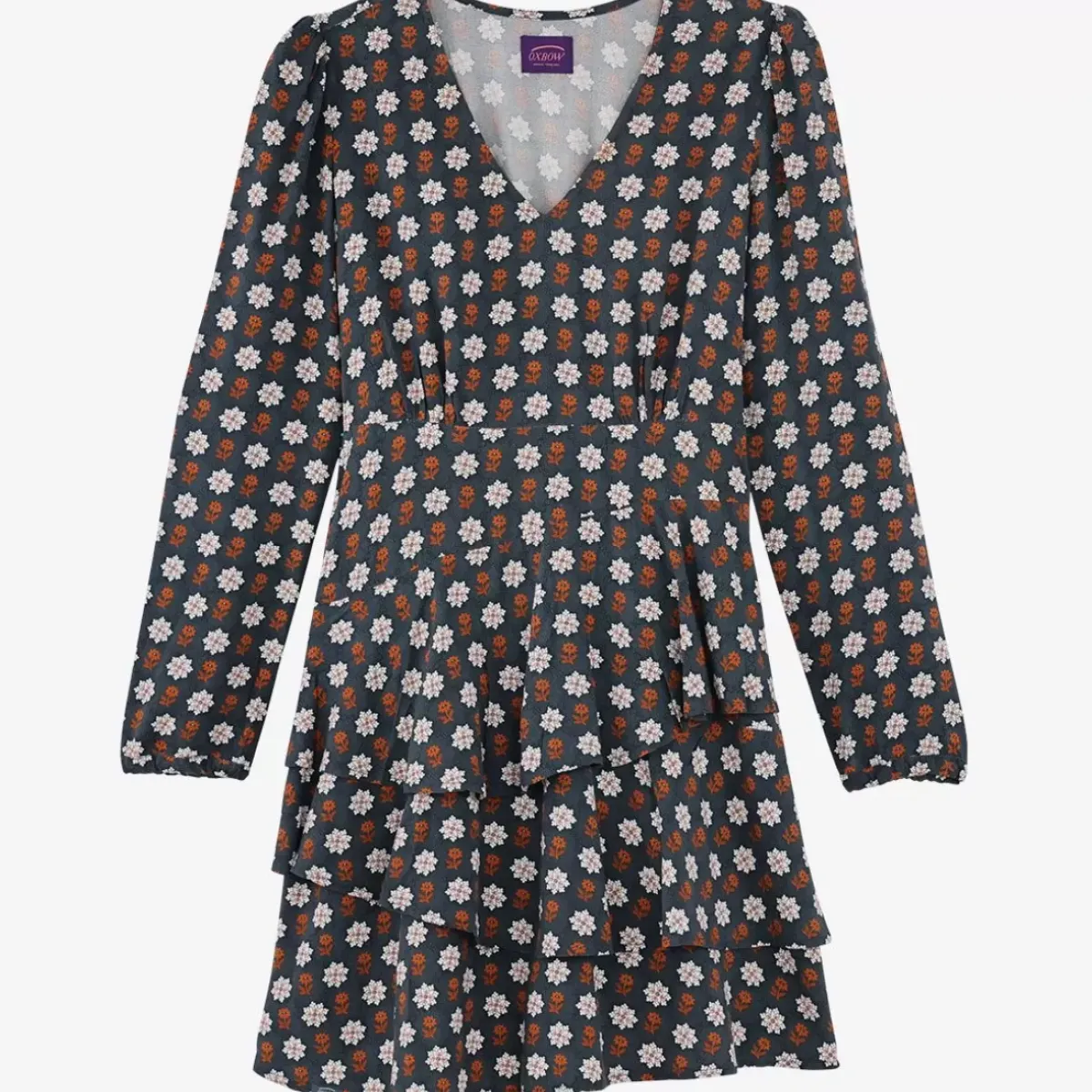 The DONOVAN ruffled dress has a V-neckline and long sleeves, all printed all over with the patterns of the collection. Its fluid material and elasticated waist will adapt to all body types.