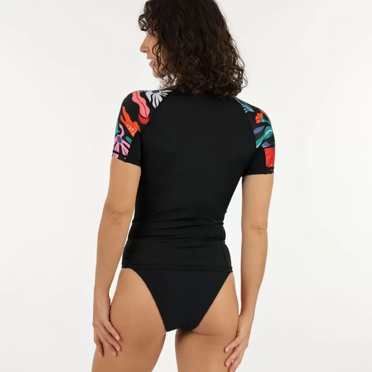 This short-sleeved lycra for women has an elastic fastening loop and overlocked topstitching for comfort. UV protection and quick drying make it a perfect ally for days in the water.