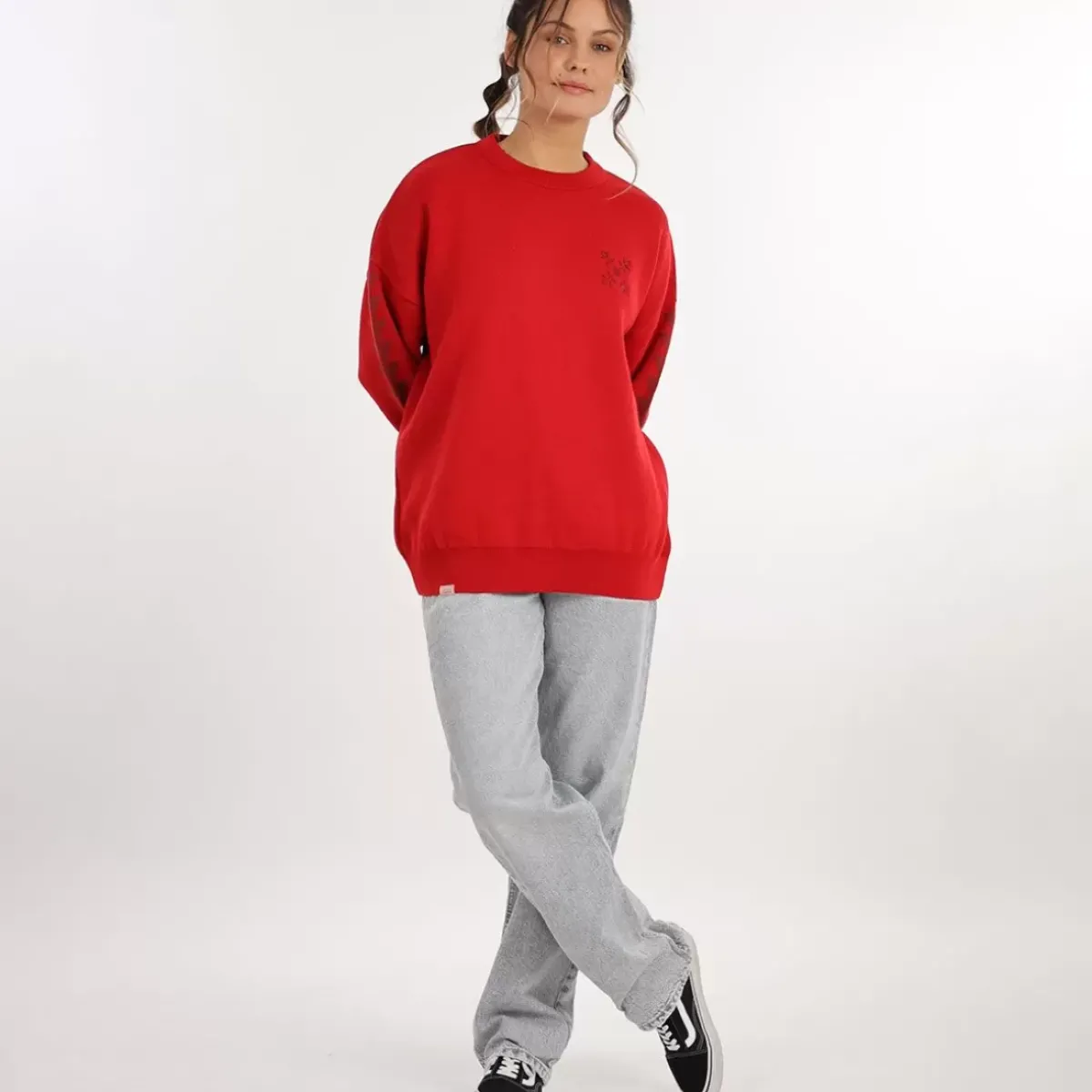 This double jacquard merino wool jumper features Collector’s classic retro cut as well as a shoulder pad and the STAY ALIVE mantra, well known to aficionados.