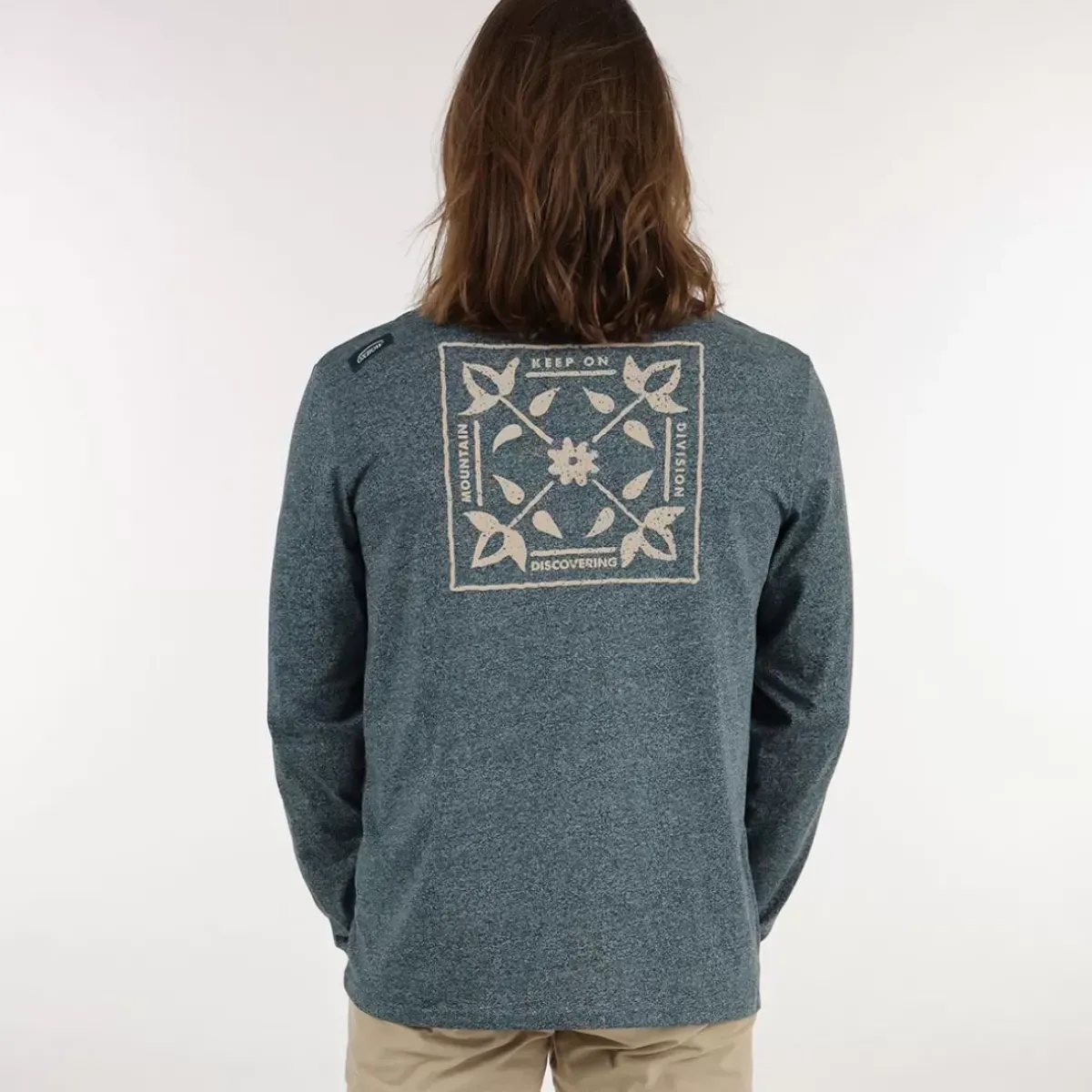 This long-sleeved T-shirt is made from a recycled material and marbled to give a mottled effect. It has a 1 color pattern on the back.