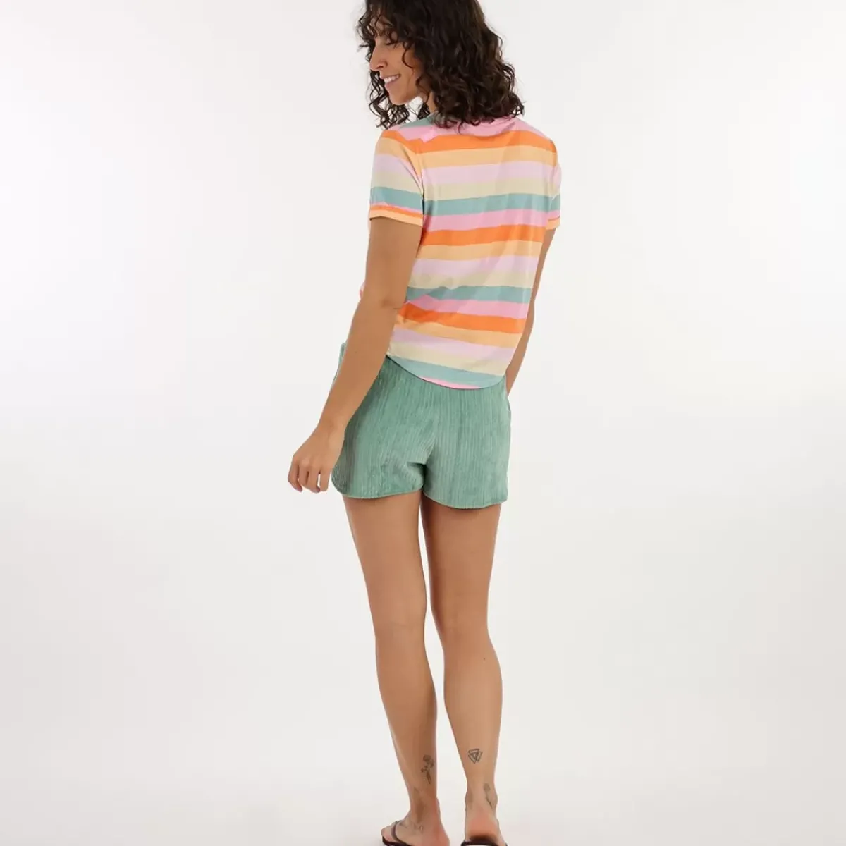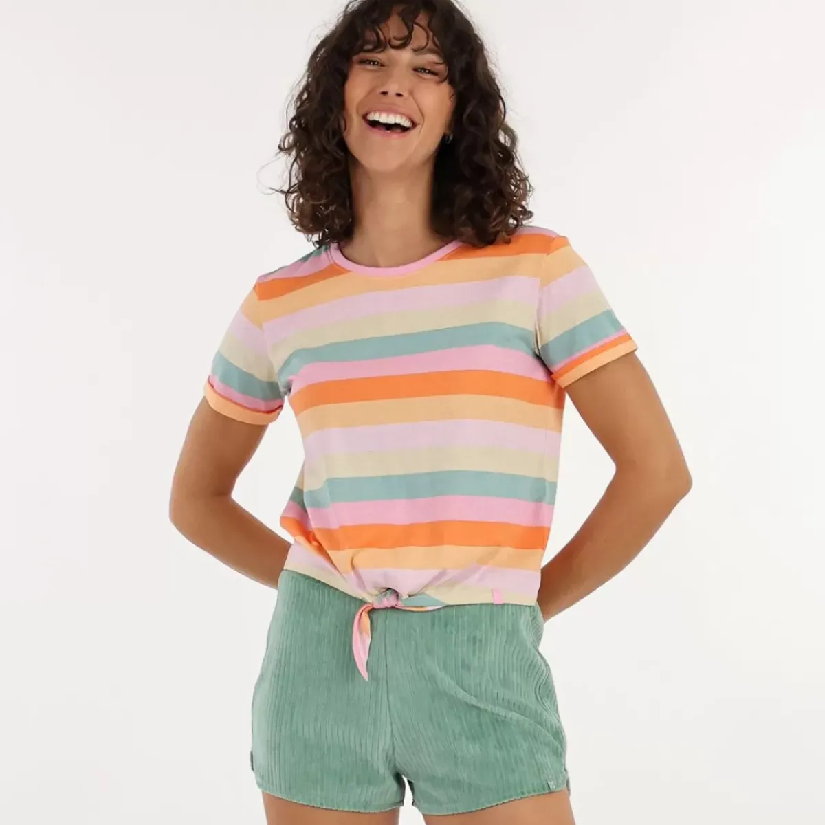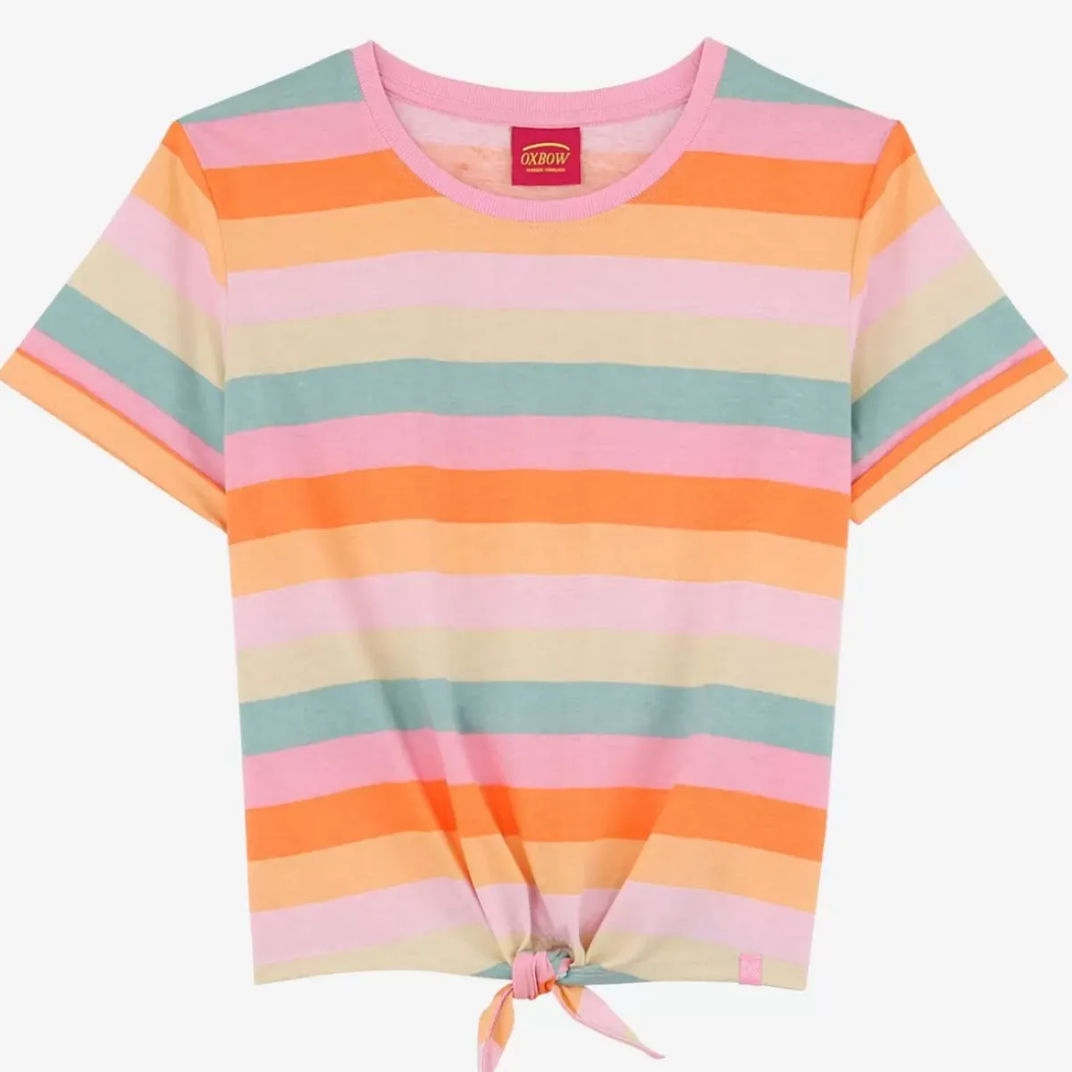 The TOSKED is a T-shirt with printed stripes, which stands out with its knot tied at the waist.